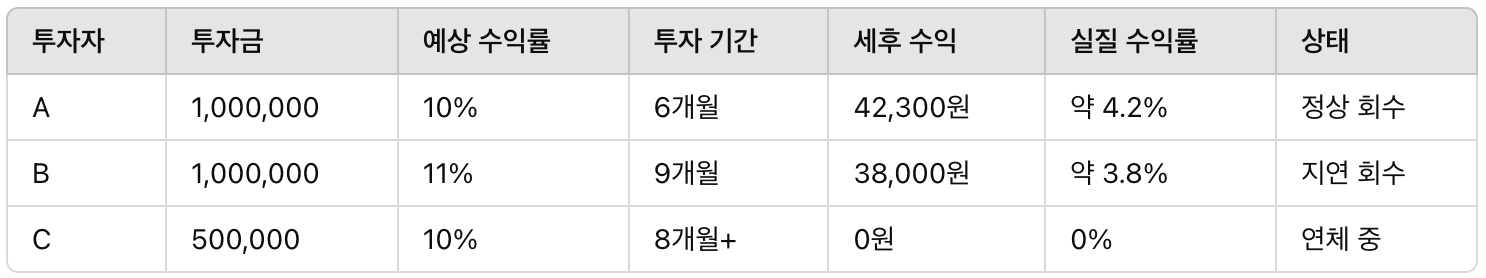 이 사례는 P2P 투자에서 시간 리스크가 수익률만큼 중요한 요소임을 보여준다.